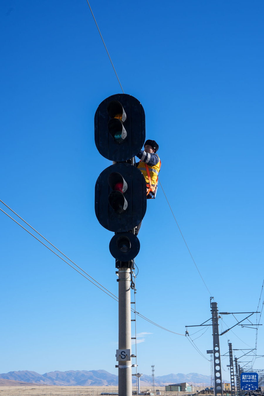 信号工孙伟在哈尔盖信号车间哈尔盖信号工区青海湖站检查信号机灯泡。