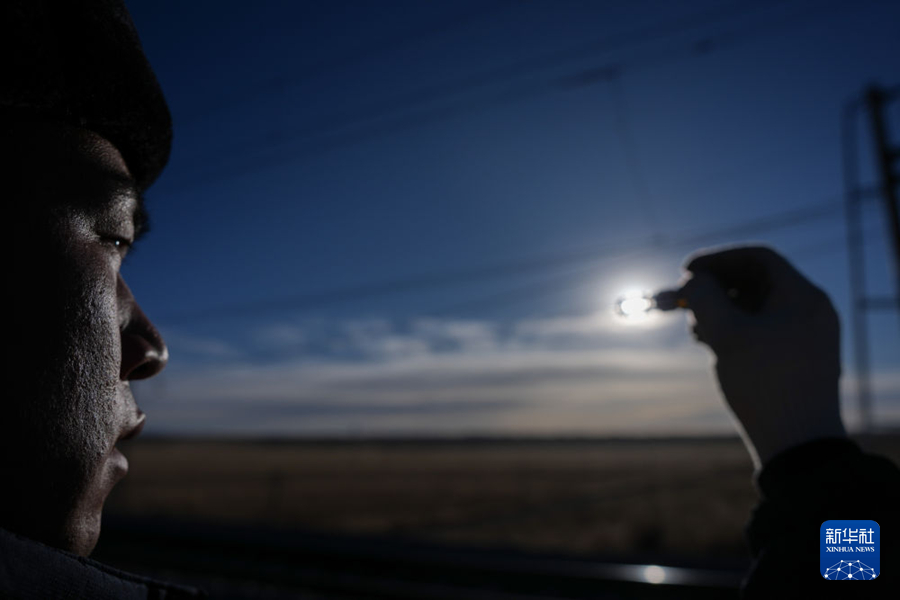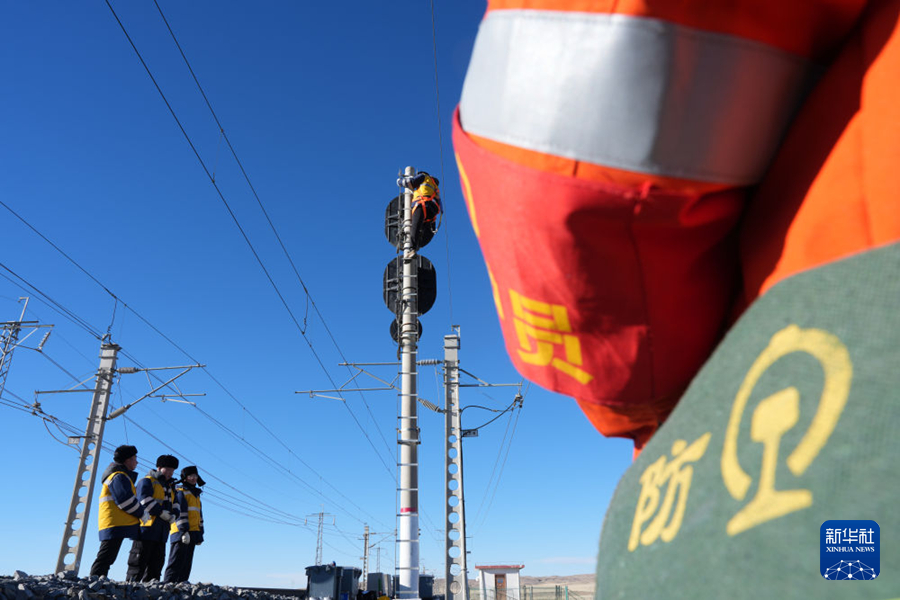 信号工们在哈尔盖信号车间哈尔盖信号工区青海湖站日常巡检。