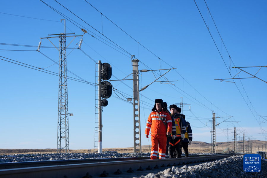 信号工们在哈尔盖信号车间哈尔盖信号工区青海湖站铁轨附近巡检。