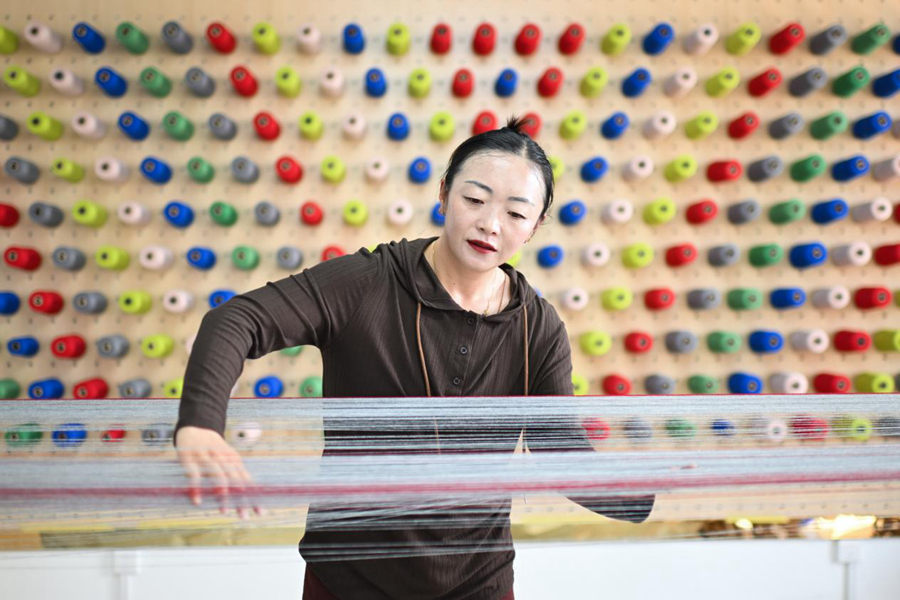2024年7月19日。在青海省果洛藏族自治州玛沁县久美家园的“沪沁怡”氆氇手工编织坊内,工作人员卓玛杰在梳经,该工坊由上海援青团队打造。新华社记者 张龙 摄